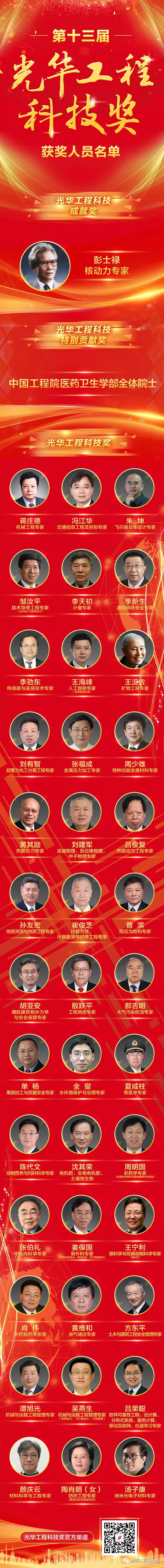 11月8日,第十三屆光華工程科技獎揭曉儀式在北京隆重舉行。中國兵器工業(yè)集團有限公司科技委副主任委員、戰(zhàn)術導彈工程專家鄒汝平獲第十三屆光華工程科技獎(獲獎人員全名單及鄒汝平事跡附后)。 光華工程科技獎由中國工程院主管,每兩年頒發(fā)一次,目前已是第十三屆,被譽為“中國工程界最高獎項”,極大地激勵了我國工程師、科學家從事工程科技研究、發(fā)展、應用的積極性和創(chuàng)造性。根據(jù)光華工程科技獎候選人提名要求,候選人需在重大工程設計、研制、建造、生產(chǎn)、運行、管理等方面解決關鍵科學技術問題或在工程科學技術及工程管理領域有重要發(fā)現(xiàn)、發(fā)明,并有顯著應用成效,或者是應用本人研究成果、發(fā)明創(chuàng)造,發(fā)展高新技術及相關產(chǎn)業(yè),成效特別顯著者才可提名。今年,全國范圍內(nèi)共產(chǎn)生了296名有效候選人。 此次揭曉儀式正式公布了從296名候選人中評選出的第十三屆光華工程科技成就獎、光華工程科技特別貢獻獎以及光華工程科技獎的獲得者,最終僅有40位專家和1個團體獲獎。本屆光華工程科技獎的獲獎科學家們,緊密圍繞國家重大戰(zhàn)略需求,瞄準經(jīng)濟建設和事關國家安全的重大工程科技問題,緊貼新時代社會民生現(xiàn)實需求和軍民融合需求,加快自主創(chuàng)新成果轉(zhuǎn)化應用,為創(chuàng)新驅(qū)動發(fā)展,建設科技強國,以及實現(xiàn)“兩個一百年”奮斗目標和中國夢做出了重要貢獻。 獲獎人員全名單