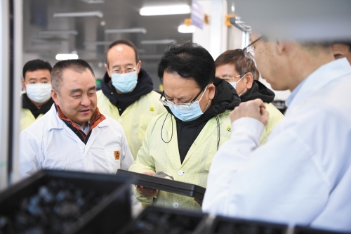 圖為景俊海等在東北工業(yè)集團(tuán)生產(chǎn)現(xiàn)場調(diào)研