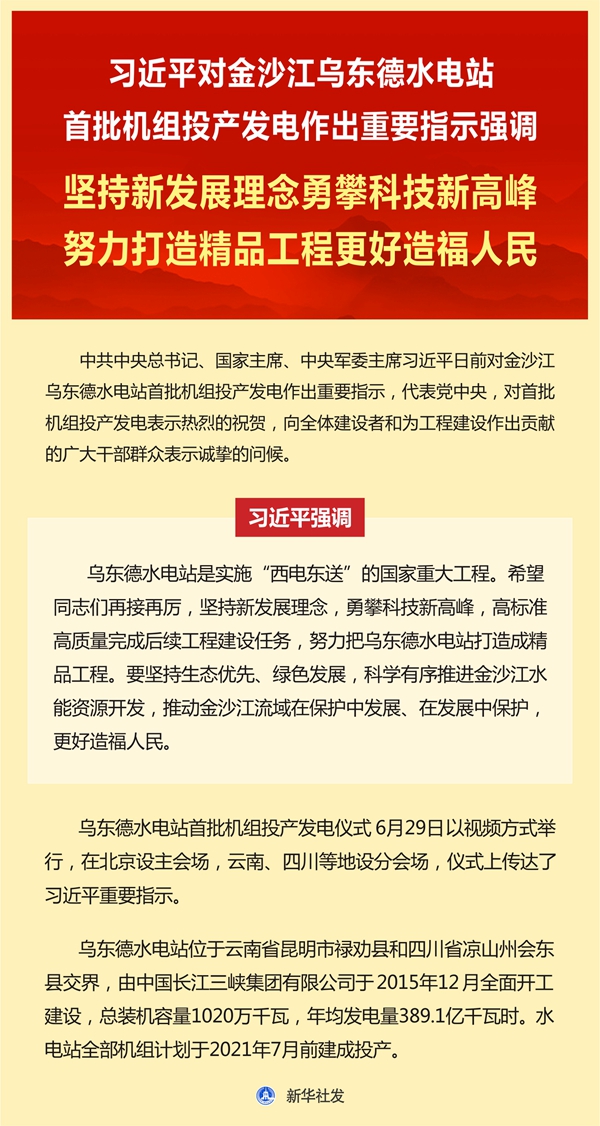 新華社北京6月29日電 中共中央總書記、國家主席、中央軍委主席習(xí)近平日前對金沙江烏東德水電站首批機(jī)組投產(chǎn)發(fā)電作出重要指示,代表黨中央,對首批機(jī)組投產(chǎn)發(fā)電表示熱烈的祝賀,向全體建設(shè)者和為工程建設(shè)作出貢獻(xiàn)的廣大干部群眾表示誠摯的問候。 習(xí)近平強(qiáng)調(diào),烏東德水電站是實(shí)施“西電東送”的國家重大工程。希望同志們再接再厲,堅(jiān)持新發(fā)展理念,勇攀科技新高峰,高標(biāo)準(zhǔn)高質(zhì)量完成后續(xù)工程建設(shè)任務(wù),努力把烏東德水電站打造成精品工程。要堅(jiān)持生態(tài)優(yōu)先、綠色發(fā)展,科學(xué)有序推進(jìn)金沙江水能資源開發(fā),推動金沙江流域在保護(hù)中發(fā)展、在發(fā)展中保護(hù),更好造福人民。 烏東德水電站首批機(jī)組投產(chǎn)發(fā)電儀式29日以視頻方式舉行,在北京設(shè)主會場,云南、四川等地設(shè)分會場,儀式上傳達(dá)了習(xí)近平重要指示。 烏東德水電站位于云南省昆明市祿勸縣和四川省涼山州會東縣交界,由中國長江三峽集團(tuán)有限公司于2015年12月全面開工建設(shè),總裝機(jī)容量1020萬千瓦,年均發(fā)電量389.1億千瓦時(shí)。水電站全部機(jī)組計(jì)劃于2021年7月前建成投產(chǎn)。