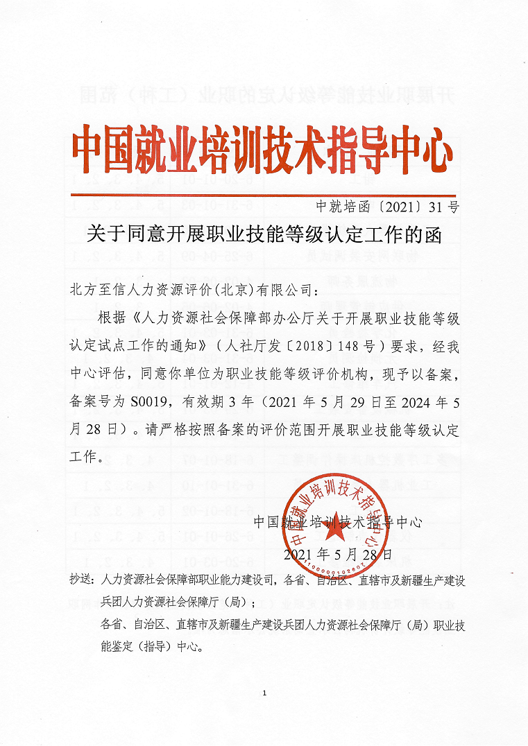 5月28日,人力資源社會保障部中國就業(yè)培訓(xùn)技術(shù)指導(dǎo)中心發(fā)布了《關(guān)于同意開展職業(yè)技能等級認(rèn)定工作的函》(中就培函〔2021〕31號),北方至信人力資源評價(北京)有限公司(以下簡稱“北方至信”)成為首家央企全國性社會培訓(xùn)評價組織職業(yè)技能等級認(rèn)定機(jī)構(gòu)。