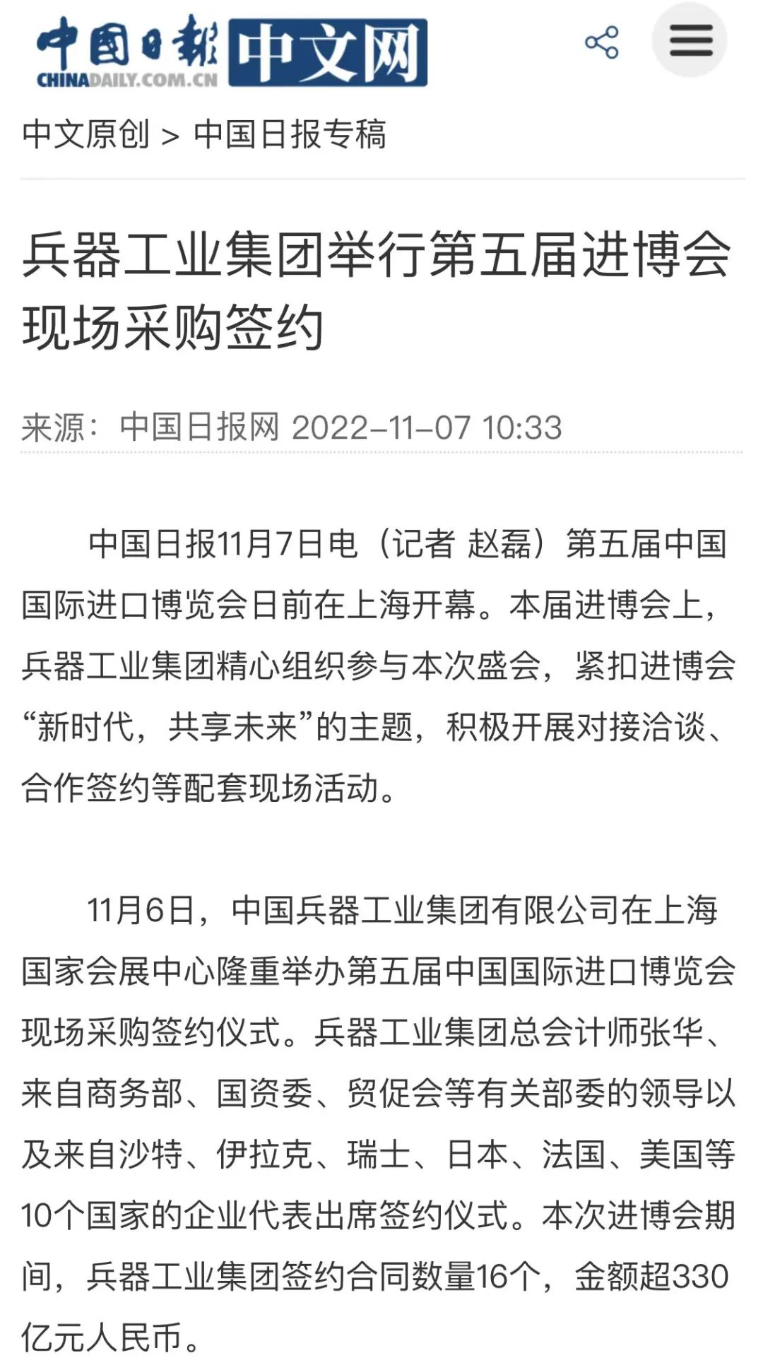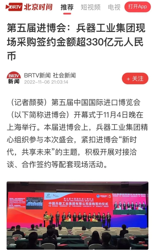 中國(guó)日?qǐng)?bào)網(wǎng):兵器工業(yè)集團(tuán)舉行第五屆進(jìn)博會(huì)現(xiàn)場(chǎng)采購簽約