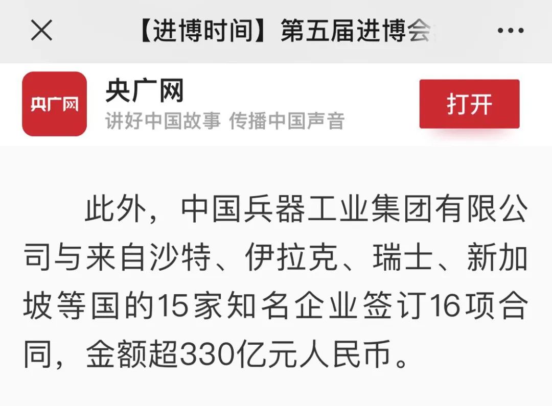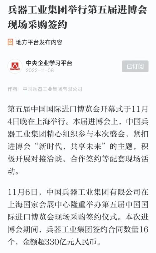 北京時(shí)間:第五屆進(jìn)博會(huì):兵器工業(yè)集團(tuán)現(xiàn)場(chǎng)采購簽約金額超330億元人民幣
