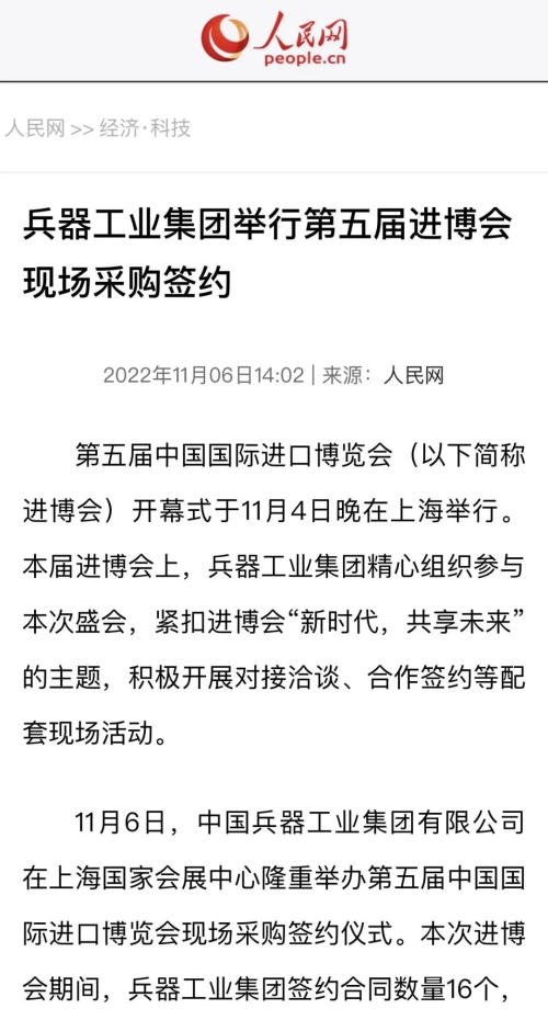 人民網(wǎng):兵器工業(yè)集團(tuán)舉行第五屆進(jìn)博會(huì)現(xiàn)場(chǎng)采購簽約